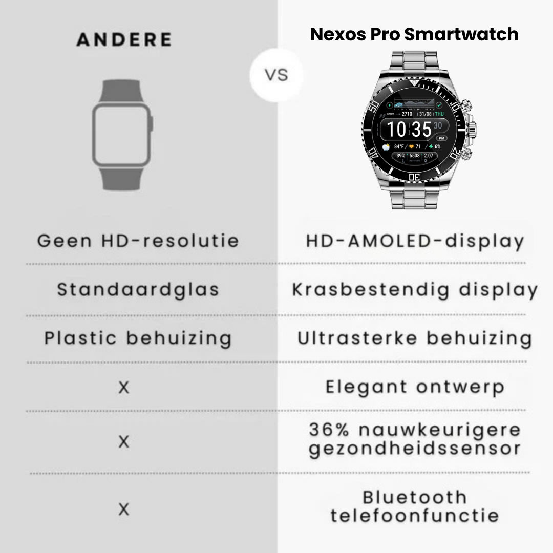 Veel smartwatches hebben een hoog prijskaartje en zijn kwetsbaar. Kies Nexos Pro, de veerkrachtige keuze ontworpen voor echte duurzaamheid.